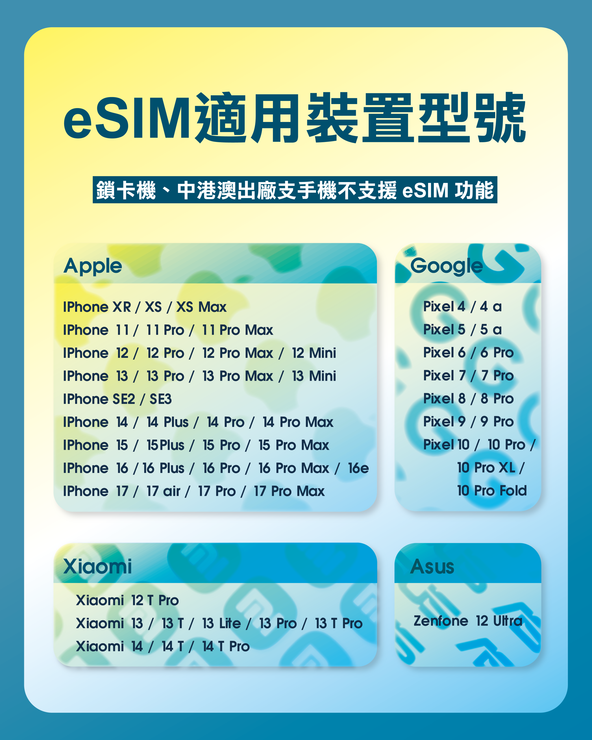eSIM 與傳統 SIM 卡差別只在於開通與使用方式,其他如網速、收訊等網路方案內容都是相同的哦!